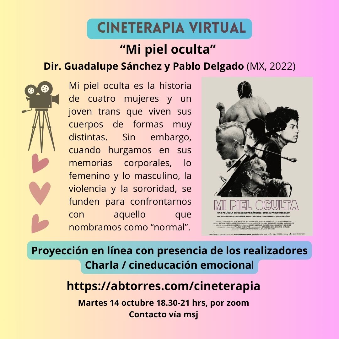 Cineterapia virtual “Mi piel oculta” El martes 14 de octubre tendremos nuestra siguiente cineterapia virtual para pasar en línea este espléndido documental: “Mi piel oculta”