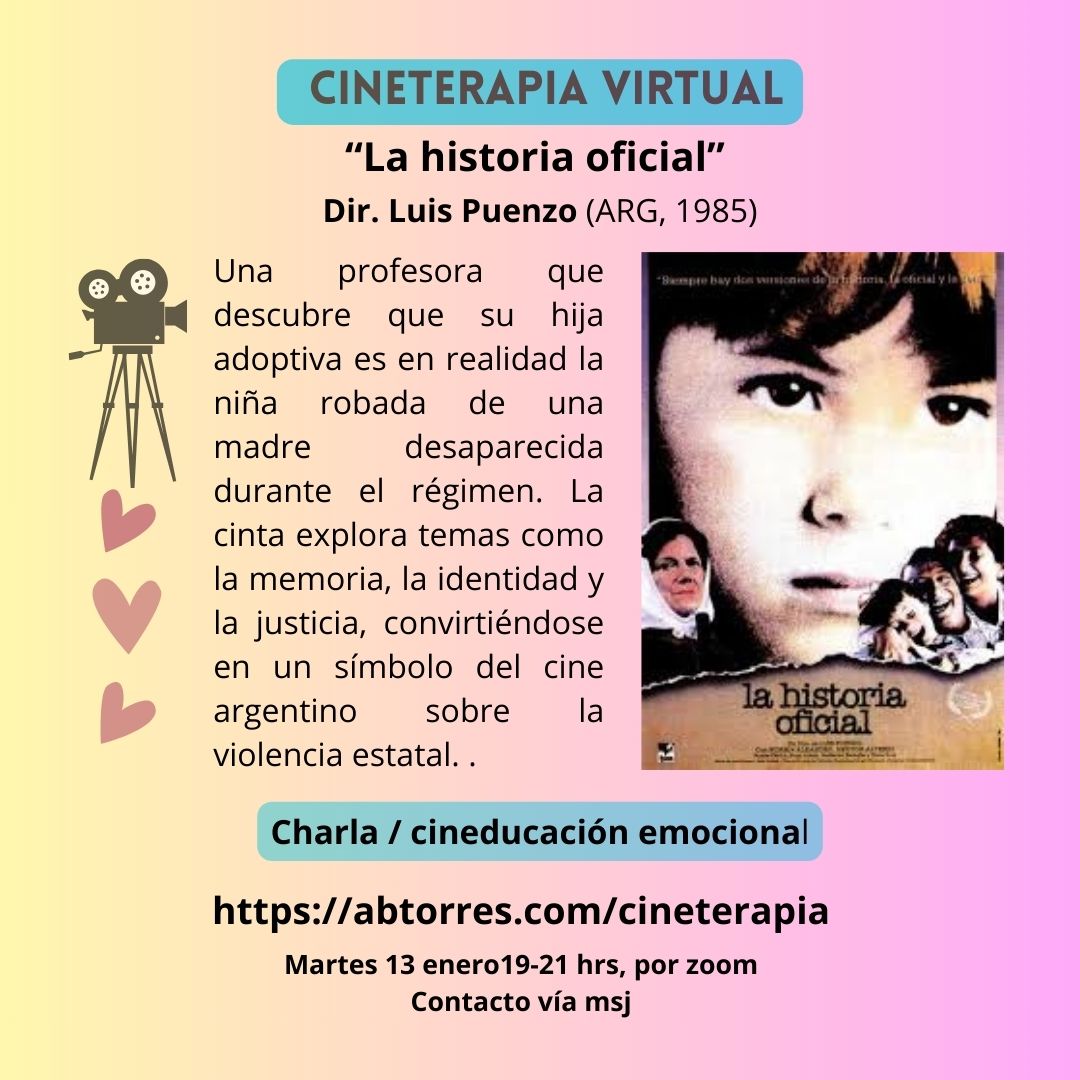 Cineterapia virtual “La historia oficial” de Luiz Puenzo ¡Regresamos este 2026 con más cineterapia virtual! No te pierdas este gran filme argentino, ganador del Óscar